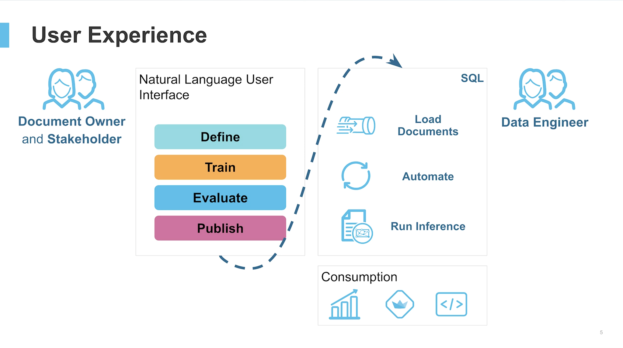 Working with Document AI follows a streamlined two-phase journey. First, users create a model build representing a specific document type. They upload sample files, define extraction targets by simply asking natural-language questions, and validate results across roughly 15–20 documents.